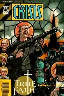 ![]() The cover of Crisis #29, spotlighting "True Faith". Terry Adair is centre, with gun; Nigel Gibson is bottom right. Left-hand side (top to bottom) are teacher Mr. Hunt, Angela Hyman and Henson. Art by Warren Pleece. | |