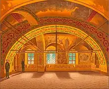 During the four centuries of its existence, the Tsarina's Golden Chamber underwent a number of structural alterations and its frescoes were repainted more than once. In 19701978 extensive restoration work was carried out there. The restoration was important because this is the only specimen of Old Russian secular monumental painting in Moscow to have survived to the present day.[2]