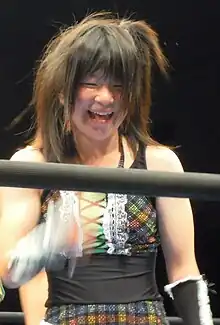 In December 2009, Tsukushi, then only twelve years old, and nine-year-old Kurumi began training professional wrestling under Emi Sakura at her promotion Ice Ribbon's dojo in Saitama. Tsukushi's training sessions with Sakura mainly took place on weekends, while on weekdays she remained in her hometown of Kamisu, training amateur wrestling with a local male junior high school wrestling team.[1] In January 2010, Tsukushi and Kurumi were entered into a trial series, which saw them both compete in three-minute time limit matches at Ice Ribbon events with those in attendance being given the right to vote on which one should be made a permanent member of the roster; the first to reach 500 votes would win the series.[6] Tsukushi made her professional wrestling debut on January 16, when she wrestled Chii Tomiya to a three-minute time limit draw.[5] During the next two months, Tsukushi also wrestled Emi Sakura twice,[7][8] Mai Ichii three times,[9][10][11] and Chii Tomiya and Hamuko Hoshi both once to a time limit draw,[12][13] before suffering her first loss on March 6, against Miyako Matsumoto.[14] On March 13, Tsukushi and Kurumi were defeated in a tag team match by Chii Tomiya and Riho.[15] After the match it was announced that Tsukushi had won the trial series 506 fan votes to 379 and had as a result earned the right to become a member of Ice Ribbon's roster.[15] The following day, she was defeated by Chii Tomiya in her official debut match.[1][16] Tsukushi earned her first win on April 29, when she pinned Tomiya in a tag team match, debuting her finishing maneuver, Harukaze ("Spring Breeze"), in the process.[17] On May 22, Tsukushi broke the record for the fastest win in Ice Ribbon history, when she pinned Emi Sakura in just five seconds.[18] The win earned her a shot at Sakura's ICE×60 Championship, Ice Ribbon's top title, however, she was defeated in the title match on June 5.[19] On July 11, Tsukushi made her debut for the NEO Japan Ladies Pro Wrestling promotion, losing to fellow Ice Ribbon worker Makoto.[20] Tsukushi's first year in professional wrestling ended with her biggest match yet, when she teamed with Natsuki☆Taiyo and Sayaka Obihiro on December 29 in a 24-minute main event, where they were defeated by Emi Sakura, Nanae Takahashi and Yoshiko Tamura.[21]
