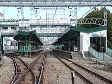 The station has one side platform and one island platform, serving a total of three tracks, with the platforms connected by a footbridge.