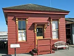 The office is a small, single-story, single-room office building (with the addition, after the historic period, of a small closet, with a sink and toilet, as well as an office cubicle). The exterior is painted a dark brownish-red, common on industrial buildings in the last century, and sometimes referred to as "mineral" red or "iron" red, with white trim. This was the color scheme of the office at the time of its move to Hyde Street Pier. The structure stands by itself at the pier, just as it did on the original site.