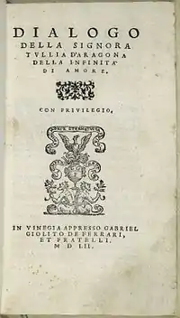 Tullia d'Aragona (1501/1505 – March or April 1556)[1] was an Italian poet, author, and philosopher. Born in Rome sometime between 1501 and 1505, Tullia traveled throughout Venice, Ferrara, Siena, and Florence before returning to Rome. Throughout her life, Tullia was esteemed one of the best female writers, poets, and philosophers of her time. Influencing many of the most famous philosophers, Tullia's work elevated women's status in literature to equal that of men. Her intellect, literary abilities, and social graces helped her become among the most celebrated of Renaissance poet-courtesans.