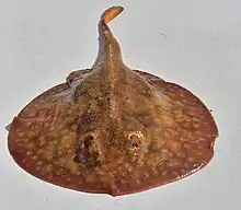 The Tumbes round stingray (Urobatis tumbesensis) is a little-known species of round ray, family Urolophidae, known only from two immature male specimens collected from estuarine waters at depths of 1–2 m, and a third specimen collected in 2006 near mangroves.[1][2] Its range appears to be limited to coastal waters off Tumbes in northern Peru, where it is found partially buried in sand or mud. The larger of the original two specimens measured 40.4 cm long and the smaller 15.7 cm.[3]