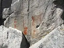 Situated on a steep cliff face, covering about 2 x 2 meters, it depicts a number of figures, among them four ships, four fishes, a large deer, wave-like patterns, and some undetermined shapes. The painting was made with a mixture of red ochre and a binder which through bonding with the rock has survived the years. At the time of its making it would have been located on an island's shore, rather than on the slope of a hill as today.[3]