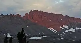 Twin Peaks has two summits, though they are not twins. The west summit is the high point at 12,323 feet (3,756 m), which makes it slightly higher than its famous neighbor, Matterhorn Peak, which is 12,279 feet (3,743 m) high.[1]