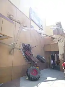 Inside the main showroom, a message is playing telling guests to get out of the house as television screens show the Channel 5 News report, with a weather anchor issuing a tornado warning. Guests are eventually led onto a set resembling the Drive-in theater scene from the movie. They line up in three separate rows on a tiered observation platform under a corrugated metal roof, overlooking an authentic sound stage outdoor scene featuring a view of the rural Galaxy drive-in theater and the Rocket Hamburgers diner at dusk as dark clouds roll overhead. Ambient night sounds and a dog barking from a distance can be heard as music plays from the diner. Suddenly, a tree gets struck by lightning, scenes from The People Under the Stairs appear on the drive-in movie screen, sirens sound briefly, strong winds are simulated, and rain falls seemingly from the sky. A small light from a flashlight can be seen moving inside the diner, as well as voices from a family within the restaurant screaming to get inside. A projected tornado drops from the sky and forms in the background. It turns and destroys the drive-in theater. Another tornado appears on stage five stories tall and twelve feet wide. The glass on the Rocket Hamburgers window shatters and as the sound effect is heard, water spits behind the guests. Dorothy, the name given to the weather device in the film, flies out of the back of a Jeep J10 (a replica of Jo's truck from the movie) as lightning flashes. The Jeep itself rolls out of its parking space and hits a fire hydrant, causing water to spray out. The Galaxy Drive-in sign rips away and crashes inside Eric's garage, followed by a prop cow flying by guests paying homage to a scene in the film. The roof of the observation platform moves as if it will be torn off, being pulled upwards. A Dodge Ram (a replica of Bill's truck from the movie) parked in front of the garage slides toward gas pumps, hitting one causing gasoline to leak. Sparks from the truck's impact can be seen starting a fire, which merges with the tornado creating a fireball that erupts three stories. As the twister dissipates, the roof falls down above guests, and the floor below gives a sudden, short drop giving guests a final scare. Bill Paxton thanks everyone for surviving Twister, directing them to exit to their left through the "Aftermath" gift shop. As guests leave, the family inside the restaurant can be seen peering out with a flashlight at the destruction outside.[18]