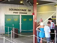 Guests first pass under the entrance and make a right turn. In the first half of the queue, guests bypass some studio props in an enclosed area behind the New York facade. A variety of songs are heard on the speakers in the area. Other visitors can see the guests bypassing the queue in the windows. There are some exit doors that guests can take if they decide not to experience the attraction. This can only be used if they are taking the standard line. A cow imprint in a metal bay door in the wall is shown on the left side. On the right side, there are Steven Spielberg, Bill Paxton, and Helen Hunt director chairs. From time to time in the attraction's later years, guests can hear the roars coming from the Hollywood Rip Ride Rockit. Guests make a left turn and enter the second half of the queue, which takes place outside in a small mock-up of the Oklahoma town of Wakita. In this area, guests can watch real tornado videos on the television screens. Each video begins with the location and date being shown as a sound effect can be heard. There are two types of sound effects, with one being horror-like wind blowing and the other being inspired by the Jurassic Park opening theme. In addition, the television screens show tornado facts that guests can read while waiting in line. Each fact features a symbol being shown on the upper left side and a tornado background. Some of the facts include debris flying across the screen. Occasionally, the Twister logo will be shown on the screens as Bill Paxton can be heard telling guests to follow the safety instructions.[17] When the attraction first opened, it featured a much larger outdoor queue with several vehicles, switchbacks, crop farms, a tool barn, a windmill and the Wakita water tower. The vehicles included Dusty's Bus (nicknamed the Barn Burner), Beltzer's Van, a Mercury Grand Marquis and a tractor. Dusty's Bus featured computer equipment and nitrogen tanks, while Beltzer's Van featured a patio with beach chairs, a cooler, an umbrella, blankets, an Oklahoma flag and a television that guests could watch the tornado videos and read the tornado facts. Guests can find an Esmoo's Dairy sign above some haybales. They are greeted by a Wakita sign, which is followed by a damaged rectangular New Channel 4 billboard featuring a map and a lady. A plastic talking cow can be found in the queue line. When guests press the button, the cow will moo and say "Drink Esmoo Milk. Fresh from the farm to your fridge." There are signs of the Fujita Scale that feature tornado pictures and description. Each picture has the location, date and type of tornado. DOROTHY II can be seen near the waiting area. As the doors to Soundstage 50 open, staff members allow guests to enter the first pre-show room.[18][19]
