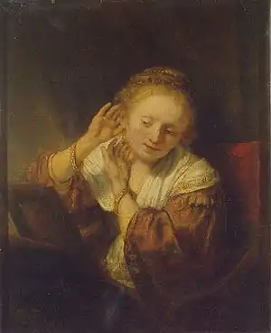 ![]() | Hendrickje Stoffels | c. 1660 | Oil on canvas | 78.4 x 68.9 | Metropolitan Museum of Art, New York | 278 | The painting is in a badly overcleaned and abraded condition |