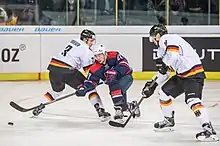Johnson (center) with the United States national men's ice hockey team in 2014