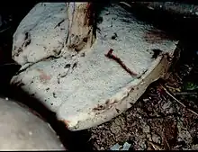 The pore surface is initially white, but will stain to a blackish color when injured.