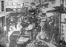 Typhoon Mary was considered the worst storm to hit Hong Kong in 23 years.[7] The typhoon arrived at the colony on June 8, dropping 35.9 centimetres (14.12 in) of rain in 24 hours.[1] Average gusts were reported at 119 kilometres per hour (64 kn) on Waglan Island, with 194 kilometres per hour (105 kn) at times. At the Royal Observatory, the storm dropped 42.7 cm (16.83 in) of rain. The mean winds blew southwesterly at 87 km/h (47 kn), exposing many small boats and villages.[9] The No. 10 warning signal was issued by the Royal Observatory. However, according to the report written by the Observatory, the use of No. 10 warning signal was not strictly justified according to international procedures, since sustained surface winds of 119 km/h (64 kn) were not observed.[9] Across the colony, damage to roads, buildings, and communication were significant. Landslides, and other fallen debris blocked roads,[1] and weak refugee shacks in the hills, made out of tin and tar paper, quickly collapsed.[6] All stores and public transportation were shut down inside the city. The Customs reported that more than 50 fishing vessels capsized and sank in the anchorages during the typhoon.[1] Two ocean freighters, the Malaya Fir and the Wan Fu,[10] ran aground onto the Kai Tak Airstrip. Although the floods have caused extreme damage, it helped with the local shortage of water, with reservoirs gaining eleven million kilolitres (3,000,000,000 US gal) of water.[1]