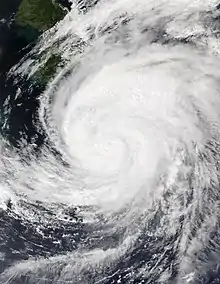 The JMA estimating a minimum central pressure of 910 hPa (26.87 inHg).[24] Nanmadol entered the Philippine Area of Responsibility, and was named Josie before eventually exiting 5 hours later.[25] Multispectral animated satellite imagery revealed a 21 nautical miles (39 km; 24 mi) surrounded eye around a deep convection.[26] The next day, Nanmadol weakened back to a Category 4-equivalent typhoon.[27] Satellite imagery revealed a rapid weakening on the system.[28] At 03:00 UTC on September 18, the JTWC further downgraded it to a Category 3-equivalent typhoon.[29] Nanmadol weakened further into a Category 2-equivalent typhoon as its structural strength began to rapidly deteriorate.[30] Nanmadol's were estimated at just 150 km/h (90 mph), which made it a Category 1-equivalent typhoon and made landfall over Southern Kyushu and a second landfall just south of Kagoshima around 18:00 UTC.[31][32] At 00:00 UTC on September 19, the JMA downgraded Nanmadol to a severe tropical storm.[33] The JTWC followed suit later that day, and declaring it tropical storm.[34] Satellite imagery revealed a swallowing convection shearing in the northeastwards.[35] At 21:00 UTC that day, the JTWC issued their final warning on the system.[36] The JMA issued its last advisory on Nanmadol, and declared it an extratropical low on September 20.[37]