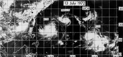 In early July 1972, conditions across the western Pacific were highly favorable for tropical cyclogenesis. Enhanced by an El Niño event, surface westerlies traversed the region south of an east–west near-equatorial trough that extended from east of the Philippines to well east of the Marshall Islands. On July 3, conditions in the upper troposphere over the basin underwent significant changes with two upper-level troughs developing in the midlatitudes; of note was one which moved southward from Japan. By July 5, four distinct disturbances had organized along the near-equatorial trough; however, limited data made further analysis on these systems difficult. The precursor to Rita specifically was situated to the southeast of Guam at this time.[2] The Japan Meteorological Agency (JMA) classified the system as a tropical depression at 12:00 UTC that day.[3]