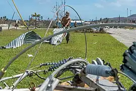 The majority of homes on Tinian were severely damaged or destroyed. Some concrete structures sustained significant damage, with a few completely destroyed, and residents reported that those buildings shook during the typhoon. Storm shutters were torn from windows, leaving the interior of structures exposed to wind and water damage. In one instance, a door was ripped from a building and hurled 30 m (100 ft) into a pigsty.[11] The island's only health center sustained major damage; however, no patients were being treated at the time.[12] Tinian International Airport suffered significant damage.[25] Total damage estimated by FEMA reached $800 million.[26]