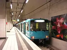 The U-Bahn Line B is the second line in the network of the Frankfurt U-Bahn. It leads in west–east direction from the central railway station (Hauptbahnhof) over the old town to Konstablerwache, where it splits into two branches to Bornheim (U4 service) and Preungesheim (U5 service). Originally planned as an independent main line, the D line represents an extension of the U4 to Bockenheimer Warte from the central railway station.