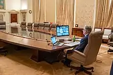 On January 27, then-acting chief of staff Mick Mulvaney convened a meeting with White House aides to draw greater attention to the virus among senior officials.[14] Two days later, on January 29, President Trump established the White House Coronavirus Task Force, led by Secretary Azar, to coordinate and oversee efforts to "monitor, prevent, contain, and mitigate the spread" of COVID-19 in the United States.[15][16][17] On February 26, Trump appointed Vice President Mike Pence to take charge of the nation's response to the virus.[18]