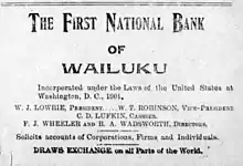 - ↑ "The Lahaina National Bank [Ad]". The Maui News. 31 March 1906. p. 2. Retrieved 20 February 2016 – via Newspapers.com.