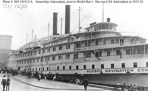 She was chartered by the US Navy for World War I service, delivered on 25 September 1917 she became USS Adirondack (ID 1270), and was officially requisitioned on 16 October 1917. For more than two years, she was employed as a floating barracks attached to the Receiving Ship at the New York Navy Yard, in a noncommissioned status. No longer required after the Armistice.[2]