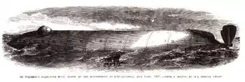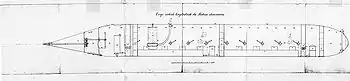 The boat was about 47 feet (14 m) long, with a beam of 4 feet 8 inches (1.42 m) and height of 5 feet 6 inches (1.68 m).[1] "It was made of iron, with the upper part pierced for small circular plates of glass, for light, and in it were several water tight compartments". She was designed to carry 18 men. For propulsion, she was equipped with 16 hand-powered paddles protruding from the sides. On 3 July 1862, the Washington Navy Yard had the paddles replaced by a hand-cranked propeller, which improved its speed to about four knots.[2] Air was supplied from the surface by two tubes with floats, connected to an air pump located inside the submarine; it was the first operational submarine to have an air purifying system.[3][1] The boat had a forward airlock, and was the first operational submarine with the capability for a diver to leave and return while both remained submerged.[3][1] Divers could affix mines to a target, then return and detonate them by connecting the mine's insulated copper wire to a battery inside the vessel.[4]