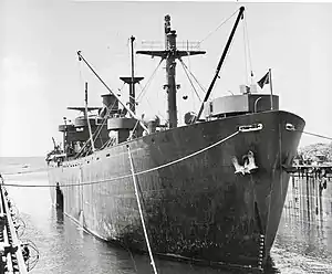 Operated under a general agency agreement by R. A. Nicol & Company, M. H. DeYoung was torpedoed by the Japanese submarine I-19 (the celebrated Cmdr. Kinashi Takakazu, commanding, who had torpedoed and sunk USS Wasp (CV-7), damaged USS North Carolina (BB-55) and caused catastrophic, mortal, damage to USS O'Brien (DD-415) in one spread of torpedoes on 15 September 1942) on 14 August 1943 about 1,000 miles east of Nouméa, New Caledonia, less than a month after being completed.[6][7] Brought into Espíritu Santo in the New Hebrides, the Liberty ship was partially repaired on board USS Artisan (ABSD-1) and taken over by the Navy under a bareboat charter at 12:01 a.m. on 4 October 1943.[8] She was renamed Antelope (IX-109) and placed in service the day she was taken over.[3][4]