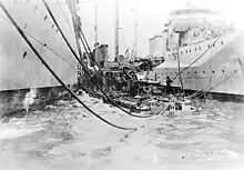 In September 1917, during her European wartime service, Benham was rammed by the British Azalea-class sloop HMS Zinnia.[22] The event is not mentioned in the Dictionary of American Naval Fighting Ships;[2] the extent of the damage to both ships is unknown. A photograph from the U.S. Navy's Naval History & Heritage Command website shows a nearly sunken Benham moored between two ships.[22]