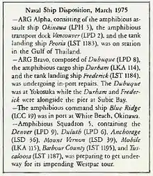 Blue Ridge was at White Beach, Okinawa when the 9th MAB was alerted on 25 March 1975 for immediate departure to Da Nang to reinforce U.S. facilities, but Blue Ridge did not get underway for Vietnam until 27 March.[30] Marines and sailors hastily trained for crowd control, evacuation procedures, and a Vietnamese orientation course. The printing section on board Blue Ridge reproduced thousands of signs in Vietnamese including a simplified instruction card for the small unit leader that included basic Vietnamese phrases and human relations oriented "do's and don'ts.[31] However North Vietnamese forces captured Da Nang on 29 March.