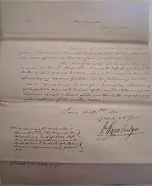 Clearing Norfolk, Virginia, on 28 April 1820, Columbus served as flagship for Commodore William Bainbridge in the Mediterranean until returning to Boston on 23 July 1821.In 1824 enslaved seaman James Hutton through his attorney Francis Scott Key brought a freedom suit against Lt. William J. Belt, USN. Judge William Cranch of the District of Columbia Court, in his verdict, found that Lt. Belt by his action in enrolling James Hutton as an Ordinary Seaman aboard USS Columbus, and USS Spark (1813) was sufficient evidence of "implied manumission" and subsequently accorded Hutton his freedom. in reaching a decision, the court relied on muster rolls of both vessels and the letter of Commodore William Bainbridge dated 6 June 1825, see thumbnail.[6]