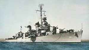 USS Cushing (DD-797) was a Fletcher-class destroyer of the United States Navy, the fourth Navy ship named for Commander William B. Cushing (18421874), who distinguished himself during the American Civil War. Cushing was launched on 30 September 1943, by Bethlehem Steel Co., in Staten Island, New York; she was sponsored by Miss Katherine A. Cushing, a daughter of Commander Cushing. The vessel's commissioning was on 17 January 1944.