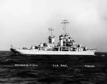 Erie was directed to participate in two ceremonies in late October. The first was Navy Day festivities in New York Harbor, from 25 to 27 October. Erie, the heavy cruisers Indianapolis and New Orleans, and the destroyers Mahan and Flusser held open houses for the general public, while docked in the Yard. The second was on 28 October, for a fiftieth anniversary ceremony commemorating the dedication of the Statue of Liberty. Indianapolis and Erie greeted President Franklin D. Roosevelt with twenty-one gun salutes as he approached Bedloe's Island and as he departed. Erie then returned to the Yard to make final preparations for her departure on 31 October, for her shakedown cruise.[4]