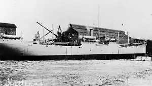Probably photographed in 1919, after World War I Navy service as USS Hatteras (ID # 2142). The ship appears to be loaded, with worn paintwork and an empty gun platform forward