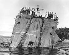 Honolulu's collapsed bow, 20 July 1943, after she was torpedoed at the battle of Kolombangara.