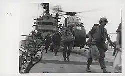 Iwo Jima landed the rotation troops at Okinawa, then came off Qui Nhon, 10 September 1965, to cover the landing of the Army's 1st Air Cavalry Division. She had supported three amphibious assault search-and-destroy raids along the coast by 1 October, when she steamed to southern waters, remaining in stand-by status for possible evacuation of U.S. nationals in revolt-torn Indonesia. Eight days later, she sailed for Danang for a helicopter squadron exchange, thence to Subic Bay where she was relieved by USS Valley Forge. Following a visit to Yokosuka, she departed 1 November for return to San Diego, arriving 17 November 1965. Several months later, she again joined the 7th Fleet Amphibious Ready Group, a fast-moving assault force that had completed more than 20 search-and-destroy operations along the South Vietnamese coast between March 1965 and September 1966. One of these missions, Operation Deckhouse IV hit only 3 miles south of the Vietnamese Demilitarized Zone to search out and decimate a regiment of the People's Army of Vietnam 342B Division, which had infiltrated into South Vietnam.