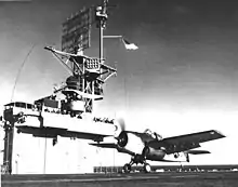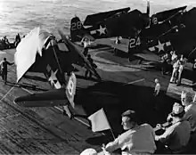 One 5 in (127 mm)/38 caliber dual-purpose gun was mounted on the stern. Anti-aircraft defense was provided by eight Bofors 40 mm (1.6 in) anti-aircraft guns in single mounts, as well as twelve Oerlikon 20 mm (0.79 in) cannons, which were mounted around the perimeter of the deck.[5] By the end of the war, Casablanca-class carriers had been modified to carry thirty 20 mm (0.79 in) cannons, and the amount of Bofors 40 mm (1.6 in) guns had been doubled to 16, by putting them into twin mounts. These modifications were in response to increasing casualties due to kamikaze attacks. Casablanca-class escort carriers were designed to carry 27 aircraft, but the hangar deck could accommodate more.[6] During Operation Dragoon, she carried 24 F6F-5 Hellcat fighters, 3 TBF Avenger torpedo bombers, and 8 F6F-3N Hellcat variant night fighters for a total of 35 aircraft, a rare occurrence, as Hellcats typically tended to operate on fleet carriers, rather than escort carriers.[6]
