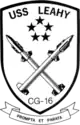USS Leahy (DLG/CG-16) was the lead ship of a new class of destroyer leaders in the United States Navy. Named for Fleet Admiral William D. Leahy, she was commissioned on 4 August 1962 as DLG-16, a guided missile frigate, and reclassified as CG-16, a guided missile cruiser, on 30 June 1975.