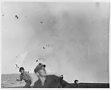 Crew on board the flight deck of Marcus Island scramble as a disintegrating kamikaze, still followed by flak, plunges into the ocean.