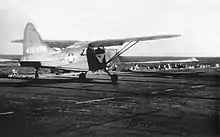 A Stinson L-5 Sentinel liaison aircraft takes off from the flight deck of Marcus Island, circa late 1944.