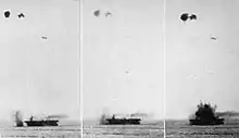 At 8:22, three kamikaze Zeros were spotted approached Marcus Island from the port quarter, at about 15,000 ft (4,600 m) in altitude, when one Zero disappeared into a cloud, and the other two reoriented themselves towards her. One Zero crossed over the carrier towards her starboard quarter, whilst the other one made a steep bank to remain at her port. The first kamikaze skimmed over her flight deck, making impact with the water just 20 ft (6.1 m) off her starboard bow, glancing a lookout platform and killing one. Scarcely ten seconds after the first attack, the second Zero dove on Marcus Island, but careened into the water 30 ft (9.1 m) off her port bow. As it entered the water, its bomb detonated, spraying shrapnel across the flight deck and injuring six of her crew.[10][19] A few minutes later, a Yokosuka D4Y dive bomber attempted to make a run against Marcus Island, but it missed with its bomb and was shot down.[20] Marcus Island was able to continue her air support operations on Mindoro.[10][21]