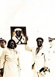 Mrs. Henrietta Miller (mother of Doris Miller), sponsor for USS Miller attending 1973 commissioning ceremony at the Norfolk Naval Shipyard