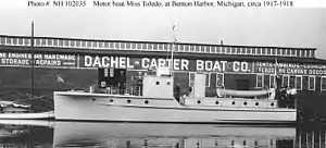 Miss Toledo as a private motorboat the shipyard of her builder, the Dachel-Carter Boat Company in Benton Harbor, Michigan, prior to her acquisition by the United States Navy. A U.S. Navy officer and at least one sailor are among the people standing on her deck.