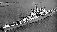 The keel for Mobile was laid down at the Newport News Shipbuilding and Dry Dock Company on 14 April 1941. She was launched on 15 May 1942, and was commissioned in March 1943.[2] The ship conducted an initial shakedown cruise in Chesapeake Bay and then went on a short training cruise to Casco Bay, Maine. Mobile then departed the East Coast of the United States for the Pacific to join the forces waging the war against Japan. She arrived in Pearl Harbor on 23 July, where she took part in a month of training to prepare for combat operations.[3]