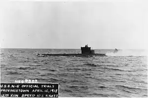 ![]() USS N-6 off Provincetown, Massachusetts, on 16 April 1918 on the 12th run of her sea trials, during which she made 10.5 knots. | |