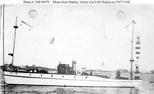 - ↑ Department of the Navy Naval History and Heritage Command Online Library of Selected Images: U.S. Navy Ships: USS Natalia (SP-1251), 1917-1918. Originally the civilian motor boat Natalia.