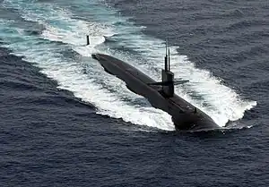 On 17 January 1989, Norfolk collided with the combat stores ship USS San Diego in the Thimble Shoals channel as both vessels were headed to sea.[2] Norfolk struck her starboard side into the port side of San Diego. There were no injuries, but both ships suffered damage. Norfolk's commanding officer was subsequently relieved of command.[3] The sub made a surface transit to Naval Submarine Base Kings Bay for drydocking and repairs within a few days,[1] and San Diego required dry dock repairs that were completed 10 April 1989.[2] As a result of this collision, COMSUBLANT issued orders limiting submarine speed and passing activities while in the restricted waters of the Hampton Roads channels.