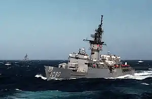 The Knox-class ships were armed with a 5"/54 caliber Mark 42 gun forward and a single 3-inch/50-caliber gun aft. They mounted an eight-round RUR-5 ASROC launcher between the 5-inch (127 mm) gun and the bridge. Close-range anti-submarine defense was provided by two twin 12.75-inch (324 mm) Mk 32 torpedo tubes. The ships were equipped with a torpedo-carrying DASH drone helicopter; its telescoping hangar and landing pad were positioned amidships aft of the mack. Beginning in the 1970s, the DASH was replaced by a SH-2 Seasprite LAMPS I helicopter and the hangar and landing deck were accordingly enlarged. Most ships also had the 3-inch (76 mm) gun replaced by an eight-cell BPDMS missile launcher in the early 1970s.[3]