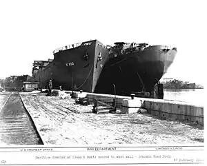 USS Pembina (AK-200) and other AKs moored at the west wall, Brandon Pool, Chicago, Illinois, 27 February 1945, waiting transit to New Orleans for fitting out and commissioning.