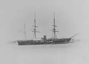 From 1869 to 1886, she was attached to the North Atlantic Squadron and was flagship from 15 September 1869 until 30 December 1870.[6] On 24 August 1873, Powhatan was caught in a storm at Halifax, Nova Scotia, Canada. She was driven from her moorings at the Cunard wharf across to the ordnance wharf.[7] She served as flagship again from 4 July 1877 until 10 December 1879. During this period, three Powhatan crewman earned the Medal of Honor for rescuing fellow sailors from drowning: Landsman George W. Cutter at Norfolk, Virginia, on 27 May 1872; Seaman Joseph B. Noil at Norfolk on 26 December 1872; and Coxswain William Anderson on 28 June 1878.[6]