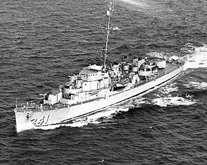 USS Raymond (DE-341) was a John C. Butler-class destroyer escort acquired by the U.S. Navy during World War II. The purpose of the destroyer escort was primarily to escort and protect ships in convoy, in addition to other tasks as assigned, such as patrol or radar picket. Post-war, she returned home with five battle stars to her credit, including credit for her striking a Japanese cruiser with her 5-inch (127 mm) guns during the Battle off Samar. The destroyer escort was named for Reginald Marbury Raymond, who was killed by enemy gunfire on 30 April 1943 aboard USS Scorpion.[1]