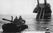 The Newport class were larger and faster than previous LSTs and were able to transport tanks, heavy vehicles and engineer groups and supplies that were too large for helicopters or smaller landing craft to carry.[6] The LSTs have a ramp forward of the superstructure that connects the lower tank deck with the main deck and a passage large enough to allow access to the parking area amidships. The vessels are also equipped with a stern gate to allow the unloading of amphibious vehicles directly into the water or to unload onto a utility landing craft (LCU) or pier. At either end of the tank deck there is a 30 ft (9.1 m) turntable that permits vehicles to turn around without having to reverse.[1][2] The Newport class has the capacity for 500 long tons (510 t) of vehicles, 19,000 sq ft (1,800 m2) of cargo area and could carry up to 431 troops.[1][7] The vessels also have davits for four vehicle and personnel landing craft (LCVPs) and could carry four pontoon causeway sections along the sides of the hull.[2][3]
