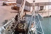 In May 1982 five ships of Amphibious Squadron 4 with 1,800 Marines from the 32nd Marine Amphibious Unit (32nd MAU) deployed to the Mediterranean with the detachment being designated Mediterranean Amphibious Ready Group 2-82 (MARG 2-82).[lower-alpha 1] MARG 2-82 arrived at Rota on 6 June and were swiftly redirected to the Lebanese coast to evacuate civilians after Israel had attacked the nation earlier that day. On 24 June 1982, during the Lebanese civil war, 800 civilians were evacuated from Juniyah, Lebanon by MARG 2-82 ships. On 28 August and 29 September, Saginaw entered Beirut harbor to provide vehicles and personnel for the Multi-National Force. By 29 October, a relief force had arrived to replace MARG 2-82 in the area, and the unit sailed for the United States on 1 November.[13] Saginaw participated in the military exercises Cold Winter 1983, Eastern Wind 87, and Teamwork 88 with NATO forces.[11]