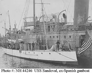 The first ship to be named Sandoval by the U.S. Navy, she was a steel gunboat launched on 20 September 1895 at Clydebank Engine and Shipbuilding Co., Clydebank, Scotland, for the Spanish Navy. She was captured on 17 July 1898 upon the surrender of Spanish forces at Santiago de Cuba. Taken in tow by the tug Potomac, Sandoval was berthed alongside Vulcan on 2 September and commissioned the same day. Upon completing preliminary repairs, Sandoval was taken in tow by the tug Manati, and beached near Fisherman's Point, Cuba. There she was careened and her hull cleaned in preparation for the voyage to the United States. Towed off the beach on 1 October, Sandoval ran steam trials on 27 October and departed Santiago Bay on 3 November.